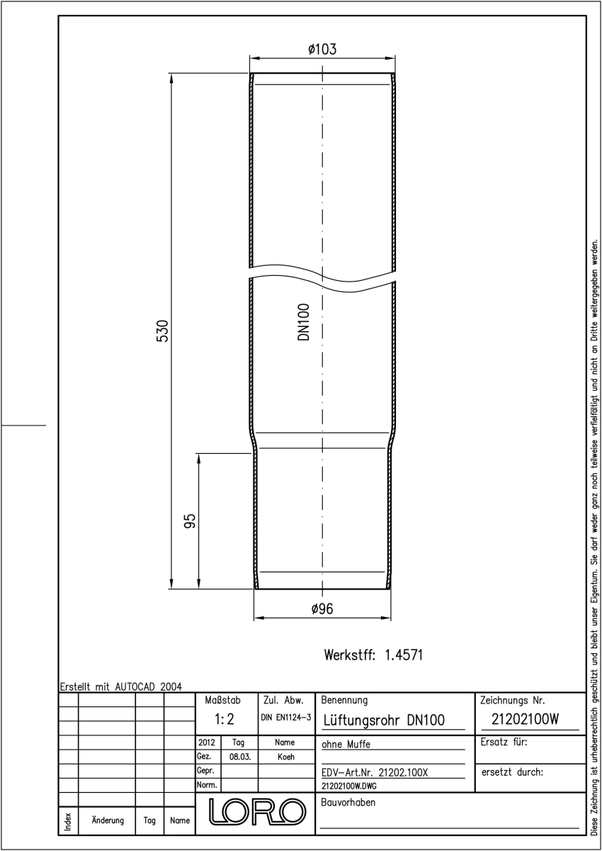 LORO-XC Lüftungsrohr, aus Edelstahl 1.4301, DN 100
