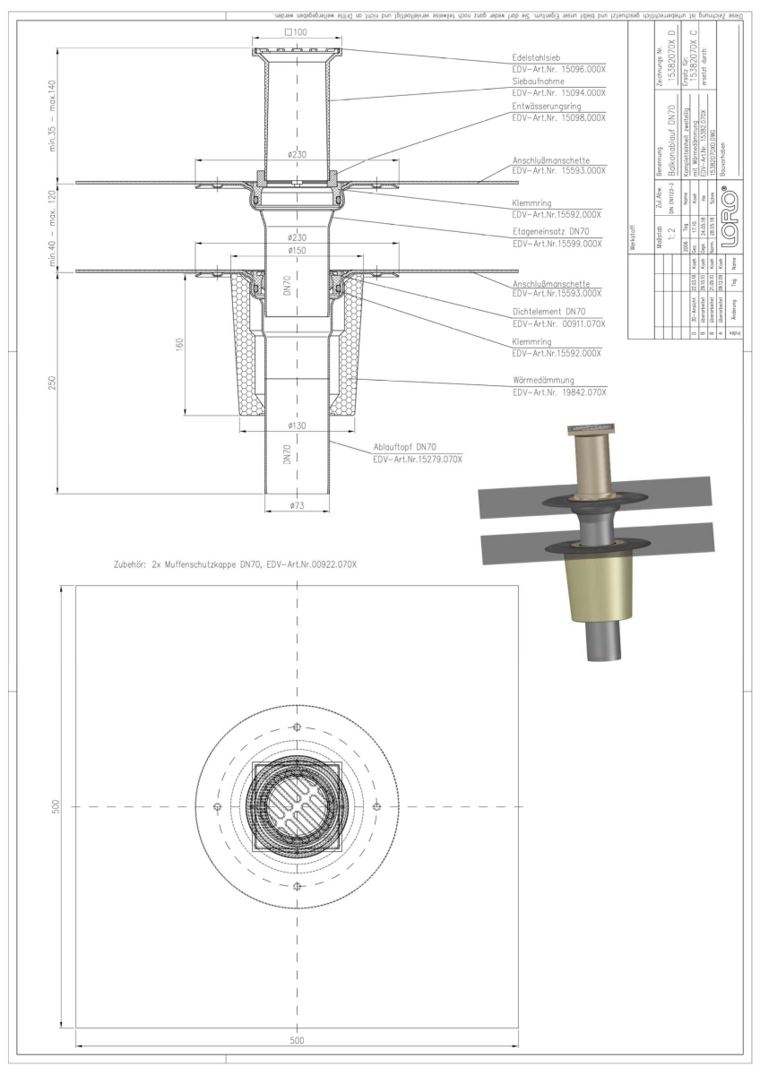 LORO-X Balkonablauf, Serie F, zweiteilig mit Wärmedämmung, Auslauf senkrecht, mit vormontierter Anschlussmanschette aus Bitumen EPDM Verbund, nach DIN EN 1253 mit erhöhtem Qualitätsstandard gemäß RAL-Gütezeichen GZ-694, aus Stahl feuerverzinkt, mit langlebiger Beschichtung gemäß DIN EN ISO 2178 auf Basis einer 2K-Epoxid-Kombination, Farbton: Rotbraun, bestehend aus Ablauftopf, Anschlussmanschette, Klemmring, Dichtelement, Etageneinsatz (für Aufbauhöhe 40 - 120 mm), Anschlussmanschette, Klemmring, Entwässerungsring, Siebaufnahme 100 x 100 mm (für Aufbauhöhe 35 - 140 mm), Edelstahlsieb, DN 70