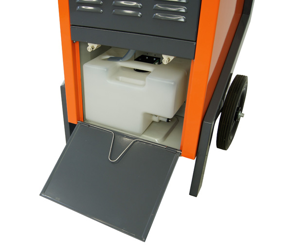 Fahrbar, digitales Bedienfeld mit integriertem Betriebsstundenzähler und ständig aktualisierter Luftfeuchtigkeitsanzeige, hygrostatgesteuert, mit auswaschbarem Luftfilter, Wasserbehälter und Schwimmerabschaltung sowie Schlauchanschluss für kontinuierlichen Wasserablauf, mit Rollkolbenkompressor und Kältemittel R 407 C (FCKW frei).