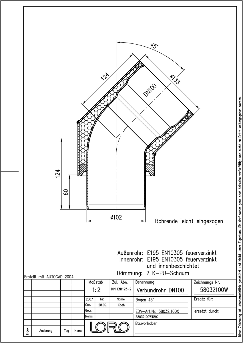 LORO-X Verbundrohr-Bogen, bestehend aus Innenrohr (LORO-X Rohr, aus Stahl, feuerverzinkt, nach DIN EN 1123, mit erhöhtem Qualitätsstandard gemäß RAL-Gütezeichen GZ-694, mit 2-Kammern-Steckmuffenverbindung, Baustoffklasse A1, formstabil, bruchfest, rückstausicher, langlebige Innenbeschichtung gemäß DIN EN ISO 2178 auf Basis einer 2K-Epoxid-Kombination, Farbton: Rotbraun), Dämmschicht (PU-Hartschaum B2, FCKW-frei) und Außenrohr (LORO-X Rohr, feuerverzinkt), 45 Grad, DN 100