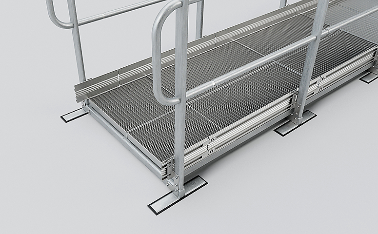 Das Aluminium-System wird einfach mit Gehwegplatten aus Beton (nicht im Lieferumfang) oder Gitterost-Elementen aus Stahl beschwert.