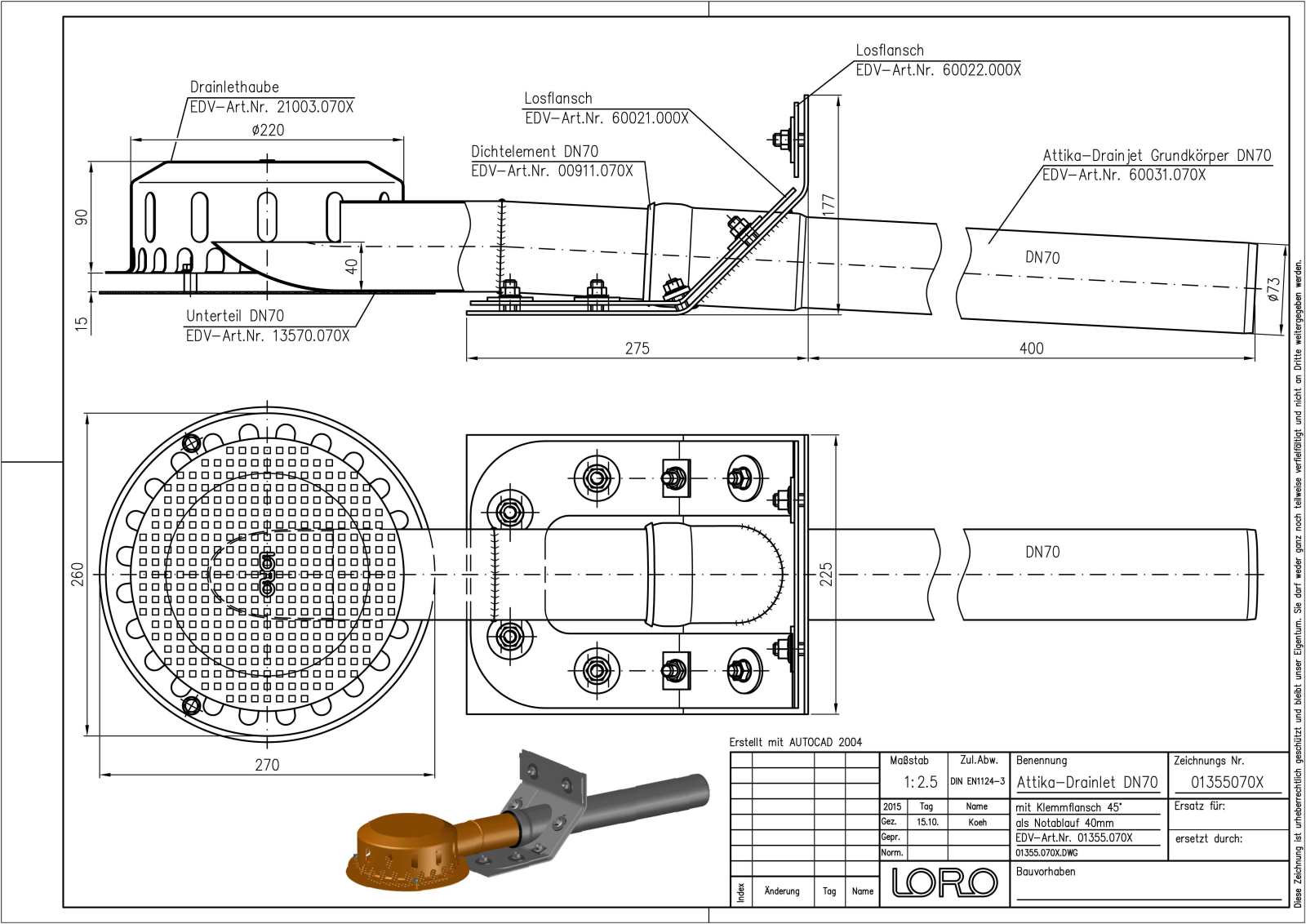 LORO-X DRAINLET Attikaablauf, Serie 62 ohne Eingriff ins Dach, für Notentwässerung mit Freispiegelströmung, Abflussleistung 1,4 l/s bei 75 mm Wasserhöhe auf dem Dach und 40 mm Wehrhöhe, mit Klemmflansch, als Los- und Festflanschkonstruktion, 45 Grad Aufkantung für Bitumen-Abdichtungsbahnen, Eingrifftiefe 0 mm, nach DIN EN 1253, Leistungsnachweis als Speier ohne Fallleitung gemäß Systemdatenblatt LX1607, aus Edelstahl, DN 70