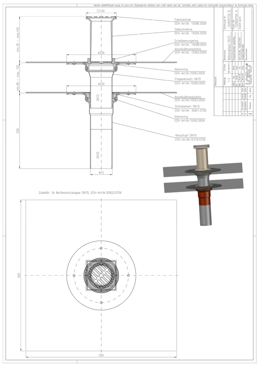 LORO-X Balkonablauf, Serie F, zweiteilig ohne Wärmedämmung, Auslauf senkrecht, mit vormontierter Anschlussmanschette aus Bitumen EPDM Verbund, nach DIN EN 1253 mit erhöhtem Qualitätsstandard gemäß RAL-Gütezeichen GZ-694, aus Stahl feuerverzinkt, mit langlebiger Beschichtung gemäß DIN EN ISO 2178 auf Basis einer 2K-Epoxid-Kombination, Farbton: Rotbraun, bestehend aus Ablauftopf, Anschlussmanschette, Klemmring, Dichtelement, Etageneinsatz (für Aufbauhöhe 40 - 120 mm), Anschlussmanschette, Klemmring, Entwässerungsring, Siebaufnahme 100 x 100 mm (für Aufbauhöhe 35 - 140 mm), Edelstahlsieb, DN 70