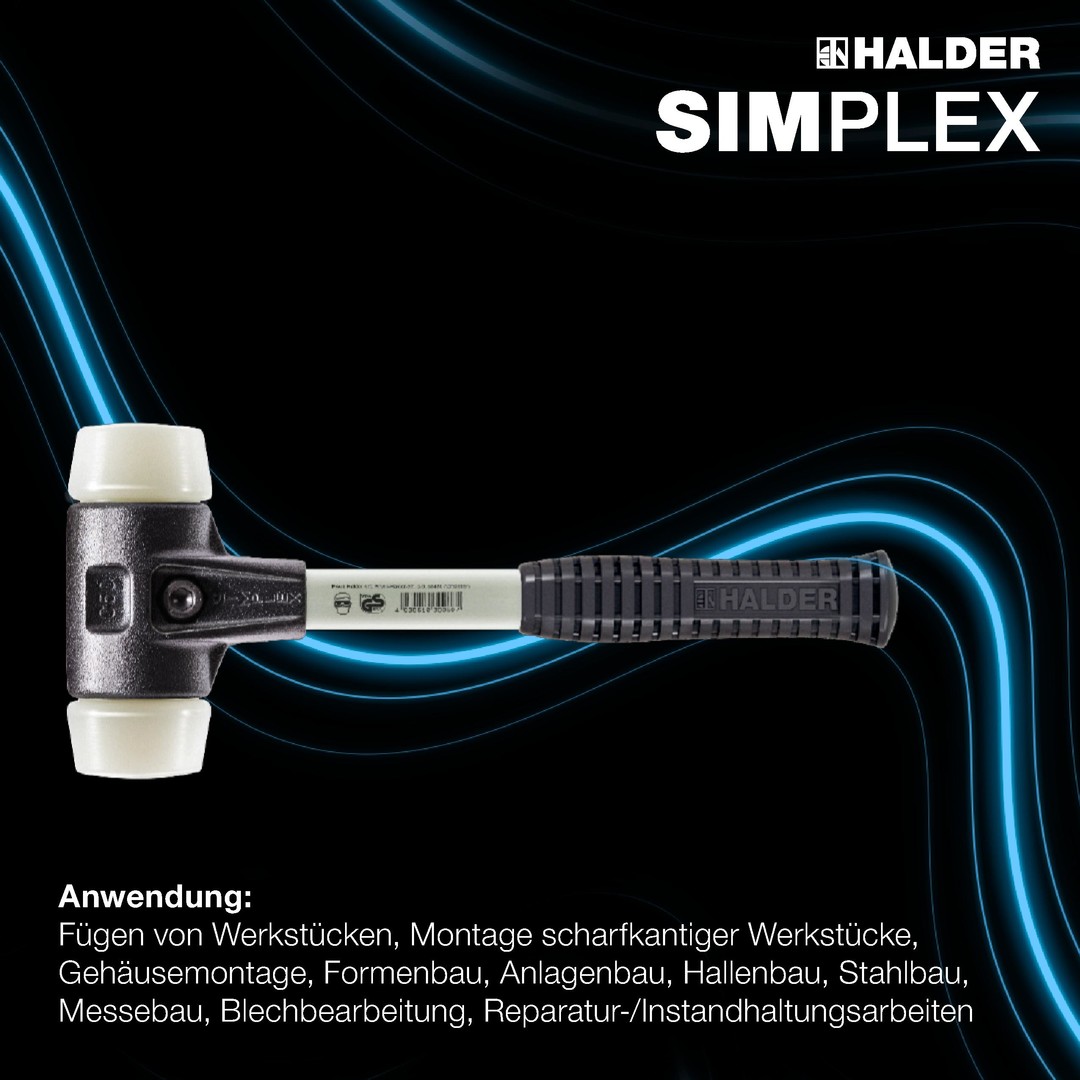 Bei diesem SIMPLEX–Schonhammer sind spezielle Schlageinsätze D50mm in das Gehäuse D40mm verbaut. Die überdimensionalen Schlagflächen ermöglichen einen maximalen Schutz für gefühlvolles Bearbeiten von Werkstücken mit empfindlichen Oberflächen.