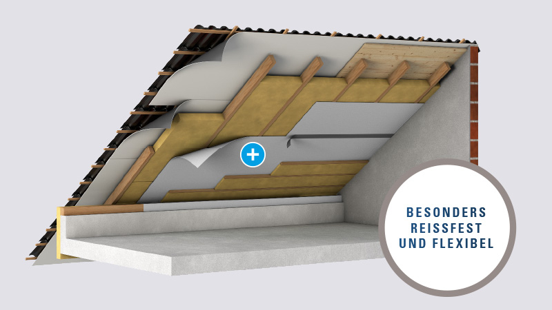 Die innovative EMDA DBS Dampfbremse, bestehend aus zwei Lagen Polypropylen-Spinnvlies, die eine monolithische Spezial-Membran einbetten, schützt die Innendachkonstruktion vor Feuchte und Zugluft.