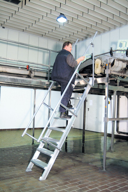 Ab einer Steighöhe von 500 mm sowie einem Luftspalt > 180 mm, zwischen Konstruktion und bauseitigem Objekt, ist gemäß DIN EN ISO 14122 an der entsprechenden Seite ein Geländer einzusetzen.