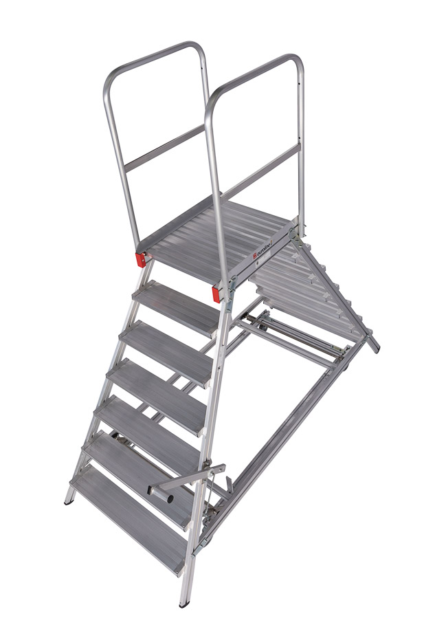 - Das Loslassen des Hebels führt die Podesttreppe automatisch in die stabile Ausgangsstellung zurück
