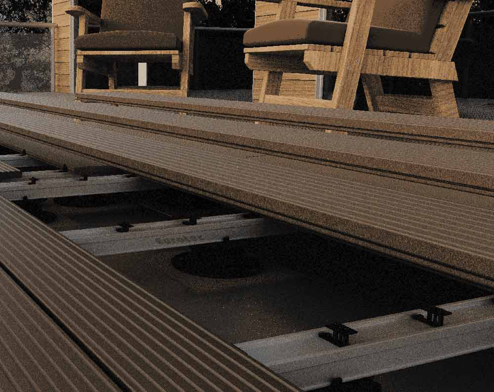 Der Alu-Systemhalter Twin wird zwischen zwei Holzdielen eingesetzt und mit einer Edelstahl-Klemmplatte in der Dielennut befestigt. Die Klemmplatte wird mit einer Bohrschraube zwischen den Fugen mit der Aluminium-Unterkonstruktion verschraubt. Die Distanzdome gewährleisten einen gleichmäßigen Fugenabstand von Diele zu Diele.