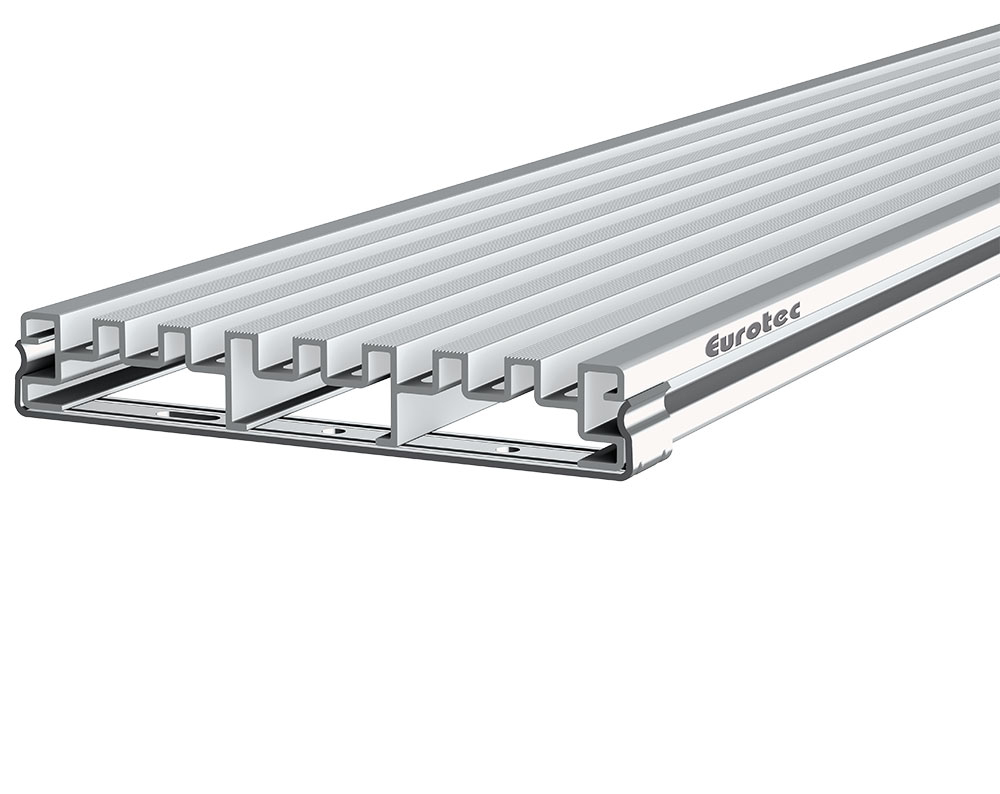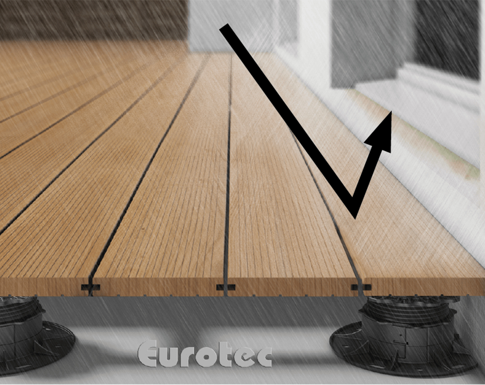 Das DrainTec Drainagerost legt sein Hauptaugenmerk auf das Anschluss-Detail von Gebäudeöffnungen. Damit sind z. B. Türanschlussbereiche oder Übergänge von vertikalen Fassadenoberflächen zu horizontalen Terrassenoberflächen gemeint. Es ist durch seine spezielle Geometrie in der Lage den Niederschlag „zu fangen“. Das Wasser gelangt somit direkt auf die Abdichtung bzw. in die Rinne, ohne das Türelement oder die Fassadenbekleidung mit reflektierendem (zurückspritzenden) Wasser zu belasten. Starkregen wird kontrolliert abgeleitet. Durch die flache Geometrie (21 x 140 mm) ist die Kombination mit marktüblichen Terrassendielen oder Feinsteinzeugplatten möglich.