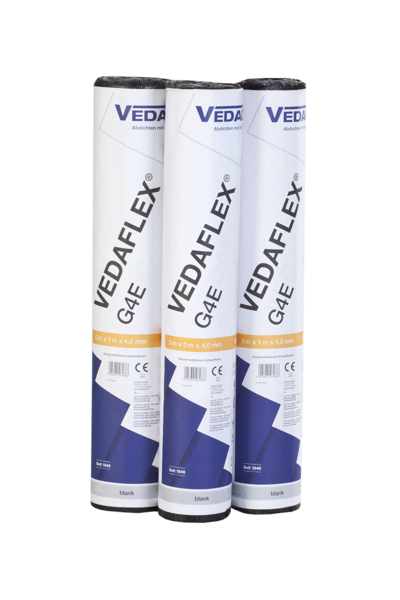VEDAFLEX G4E ist eine Elastomerbitumen-Schweißbahn für mehrlagige Dachabdichtungen oder für Bauwerksabdichtungen in höchster Qualität gemäß DIN EN 13707, DIN EN 13969, DIN V 20000-201 und DIN V 20000-202 mit technischen Werten über den Mindestanforderungen der Normen.