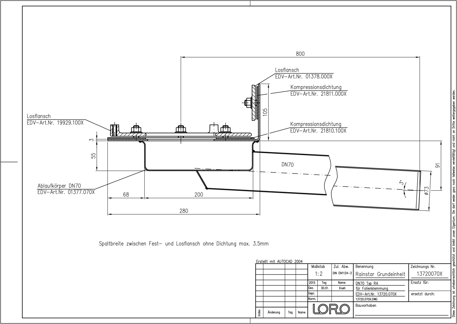 mit Klemmflansch als Los- und Festflanschkonstruktion für Kunststoff-Abdichtungsbahnen aus Edelstahl DN 70
