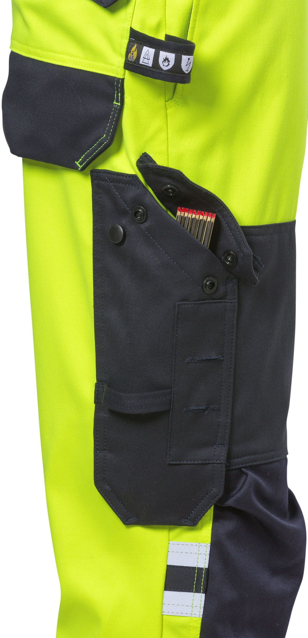 Schmutz-, öl- und wasserabweisend / 2 Vordertaschen / 2 CORDURA®-verstärkte Gesäßtaschen mit Patte und verdecktem Druckknopfverschluss / Doppelt verstärkte Schrittnaht / Hammerschlaufe / CORDURA®-verstärkte Zollstocktasche mit Patte und verdecktem Druckknopfverschluss und Knopf sowie Schlaufe für Arbeitsmesser / Beintasche mit Patte und verdecktem Druckknopfverschluss, Handytasche mit Patte und Klettverschluss, D-Ring unter der Patte / CORDURA®-verstärkte Knietaschen, von innen zugänglich / Höhenanpassung der Kniepolster in den Knietaschen möglich / CORDURA®-verstärkte Beinabschlüsse / Doppelnaht an Reflexstreifen / Geprüft und zugelassen gemäß EN EN 14404 zusammen mit den Kniepolstern 124292, EN 61482-1-2 Klasse 1, EN 61482-1-1-1 EBT: 10,3 cal/cm2 HAF: 80% (siehe Lichtbogen-Tabelle für zertifizierte Bekleidungskombinationen für EN 61482-1-2 Klasse 2 und offenen Lichtbogen nach EN 61482-1-1-1-1), EN ISO 11612 A1 B1 C1 F1, EN 1149-5, EN ISO 11611 A1 Klasse 1 (siehe Flamm- und Schweißtabelle für zertifizierte Bekleidungskombinationen), EN 13034 Typ PB [6], EN ISO 20471 Cl 2 / Industriewäsche geeignet gemäß ISO 15797 / OEKO-TEX® zertifiziert.