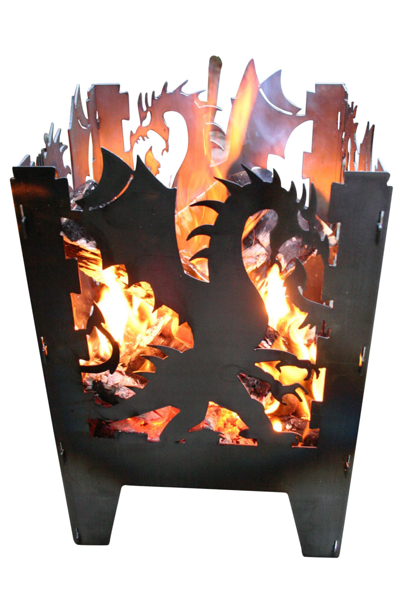 Feuerkorb Größe L Motiv Drache aus Rohstahl - Stecksystem - mit Ascheblech und massiven integriertem Gitterrost