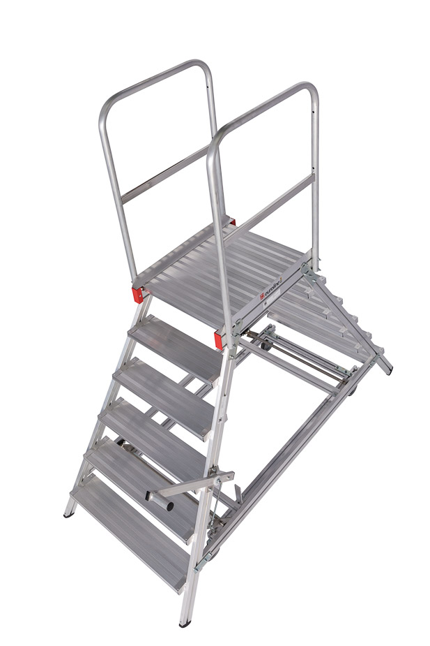 • Durch Drücken des Hebels kommt die Podesttreppe in die fahrbereite