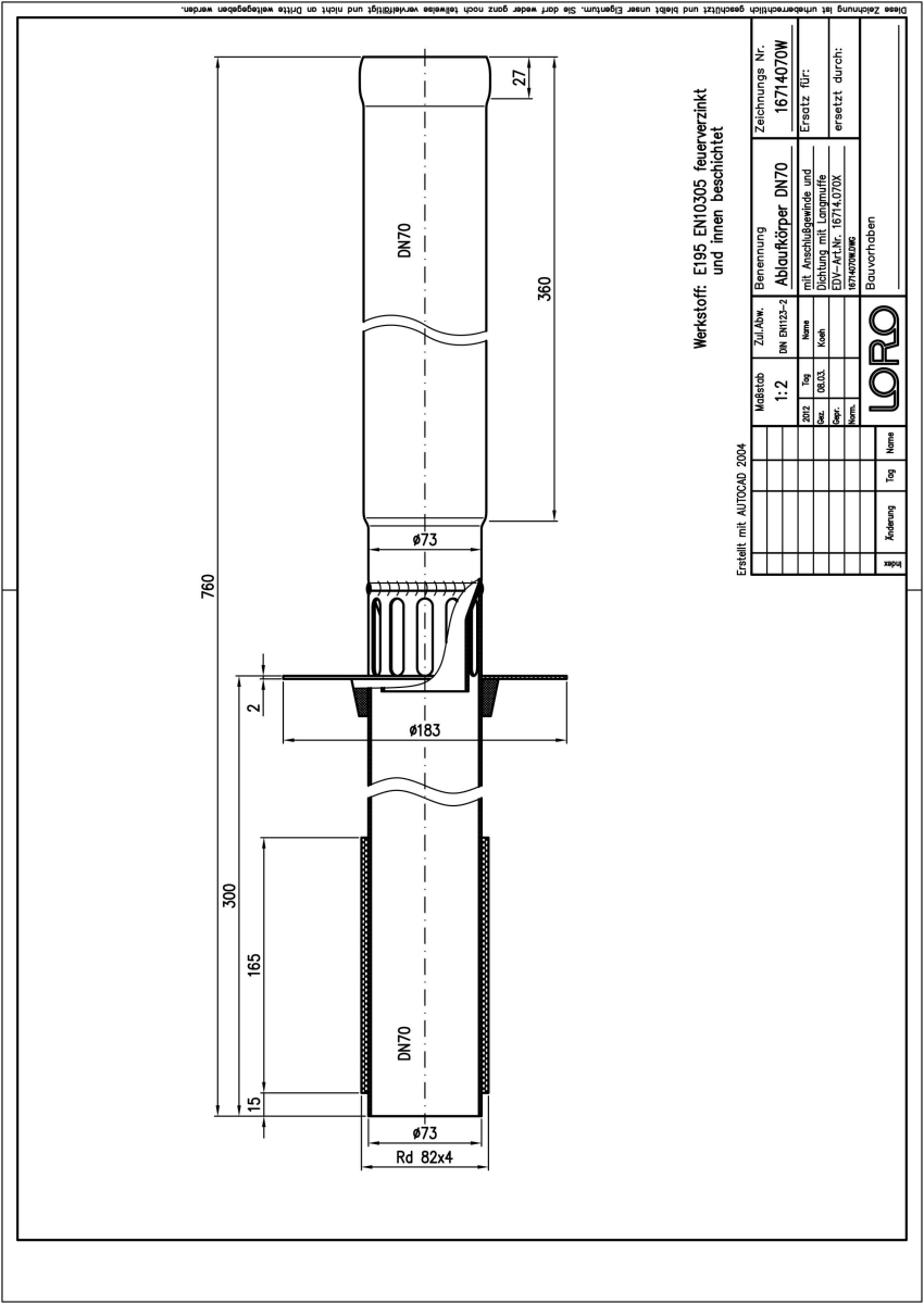 LORO-VERSAL Direktablaufkörper mit Stützrand, mit Langmuffe, Anschlussgewinde und Dichtung, Serie J, für Balkongeschosse und untere Balkone, aus Stahl, feuerverzinkt , langlebige Innenbeschichtung gemäß DIN EN ISO 2178 auf Basis einer 2K-Epoxid-Kombination, Farbton: Rotbraun, für Deckenstärke 150 - 250 mm, DN 70