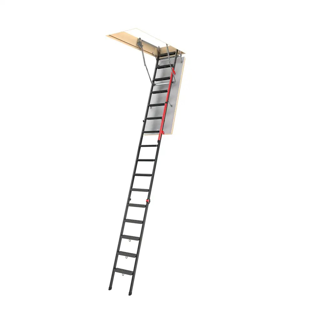 Die Bodentrppe LMP gehört zur neuen Generation der FAKRO Bodentreppen und ermöglicht für sehr große Raumhöhen (ab 300 bis 366 cm) einen sicheren Zugang zum Dachboden. Um die Bediensicherheit und den -komfort zu erhöhen, ist die Bodentreppe mit einem im Metallhandlauf versteckten Entlastungsmechanismus ausgestattet. Die beidseitig in weiß beschichtete Öffnungsklappe sorgt für optimale Wärmedämm-Parameter (Öffnungsklappe 3,6 cm stark). Die Klappenarretierung im geöffneten Zustand sorgen für eine einfache Bedienbarkeit und höchste Sicherheit.