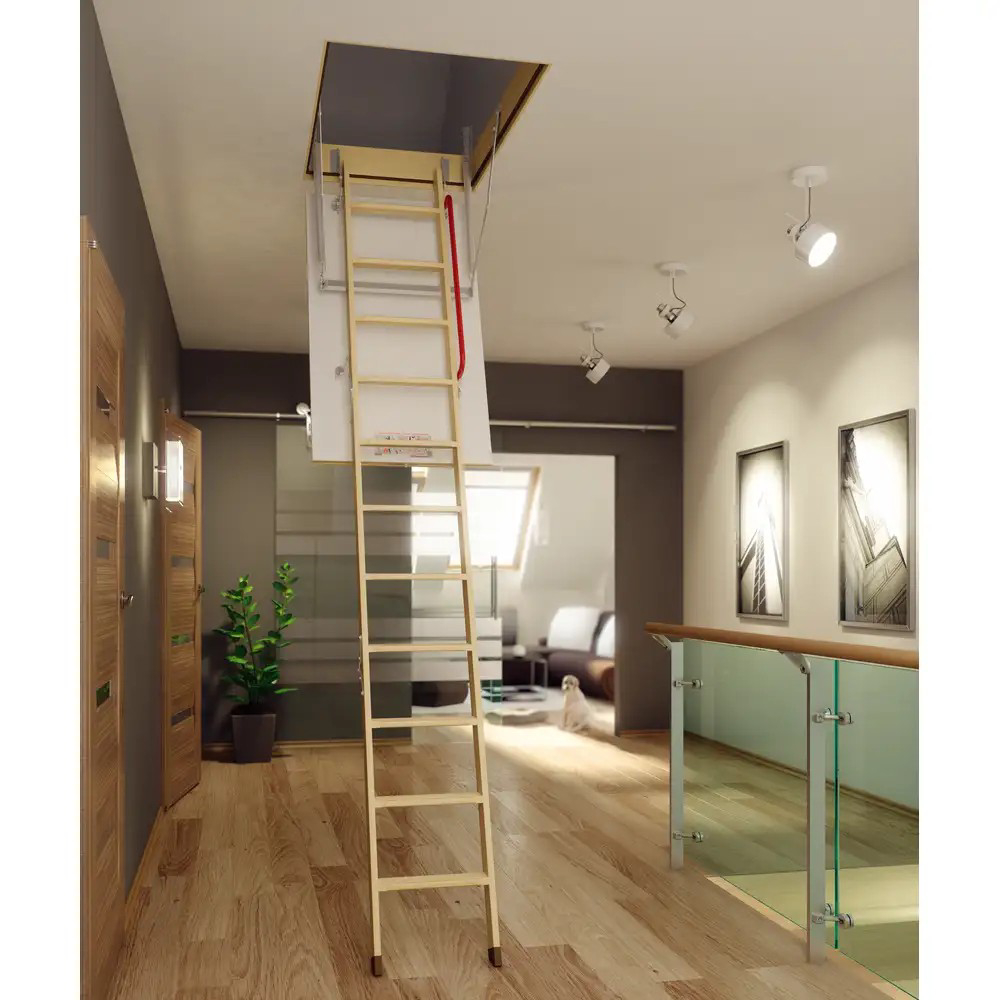 Die Bodentreppe LWK Komfort verfügt über weiterführende Komfortmerkmale wie die Ausstattung mit einem Metallhandlauf, einer weißen Öffnungsklappe sowie Bodenschutzkappen in der dreiteiligen Ausführung. Die Bodentreppe sorgt für sehr gute Wärmedämm-Parameter. Die Konstruktion der Treppenleiter erhöht den Nutzkomfort. Ein durdachtes Montagesystem ermöglicht einen schnellen und einfachen Einbau in der Decke.