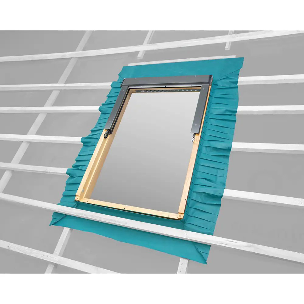 Die dampfdurchlässige Folienanschluss dient der einfachen und sicheren Verbindung des Fensters mit der in der Dachkonstruktion vervendeten Unterspannbahn. Er ist aus einem Gewebe mit hoher Dampfdurchlässigkeit gefertigt. Ein weiterer Vorteil besteht darin, dass die seitlichen Teile des Anschlusses direkt auf den Dachlatten befestigt werden. Die Abstände zwischen den Latten und deren Stärke müssen hierfür nicht berücksichtigt werden.