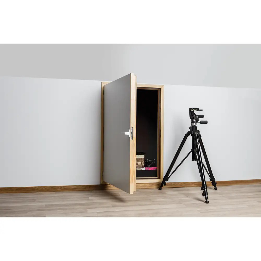 Die Kniestocktür DWT wird in den Drempel eingebaut und ermöglicht einen Zugang zum dahinter liegenden Stauraum. Die sehr gute Thermoisolation der Kniestocktür (U-Wert 0,6 W/m2K) und die hohe Dichtheit vermindern Wärmeverluste in den dahinter liegenden Stauraum. Die Türen können mit Anschlag links oder rechts montiert werden. Die Kniestocktür ist mit 3,5 cm breiten Blendleisten in natur ausgestattet. Der Türflügel wird standardmäßig 6,6 cm stark ausgeführt und besteht aus einem Kiefernholzrahmen, der beidseitig mit weißen HDF-Platten versehen ist.
