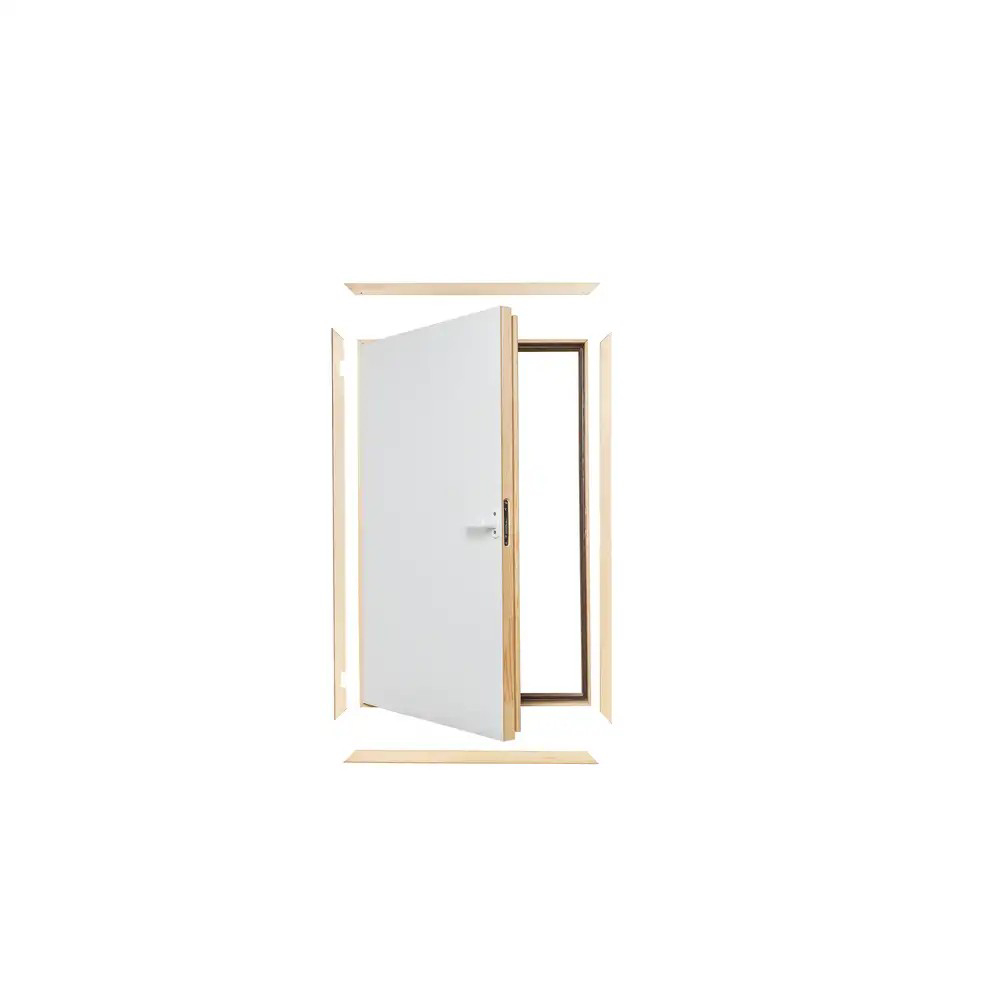 Die Kniestocktür DWT wird in den Drempel eingebaut und ermöglicht einen Zugang zum dahinter liegenden Stauraum. Die sehr gute Thermoisolation der Kniestocktür (U-Wert 0,6 W/m2K) und die hohe Dichtheit vermindern Wärmeverluste in den dahinter liegenden Stauraum. Die Türen können mit Anschlag links oder rechts montiert werden. Die Kniestocktür ist mit 3,5 cm breiten Blendleisten in natur ausgestattet. Der Türflügel wird standardmäßig 6,6 cm stark ausgeführt und besteht aus einem Kiefernholzrahmen, der beidseitig mit weißen HDF-Platten versehen ist.