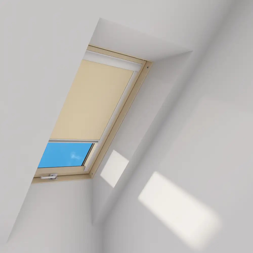 Eine große Auswahl an Farben und Mustern ermöglicht die beliebige Innengestaltung in jedem Dachboden. Die Aluminium-Führungsschienen verdecken die Stoffkanten und ermöglichen die Arretierung des Rollos in beliebiger Position sowie die stufenweise Regulierung des Lichteinfalls.