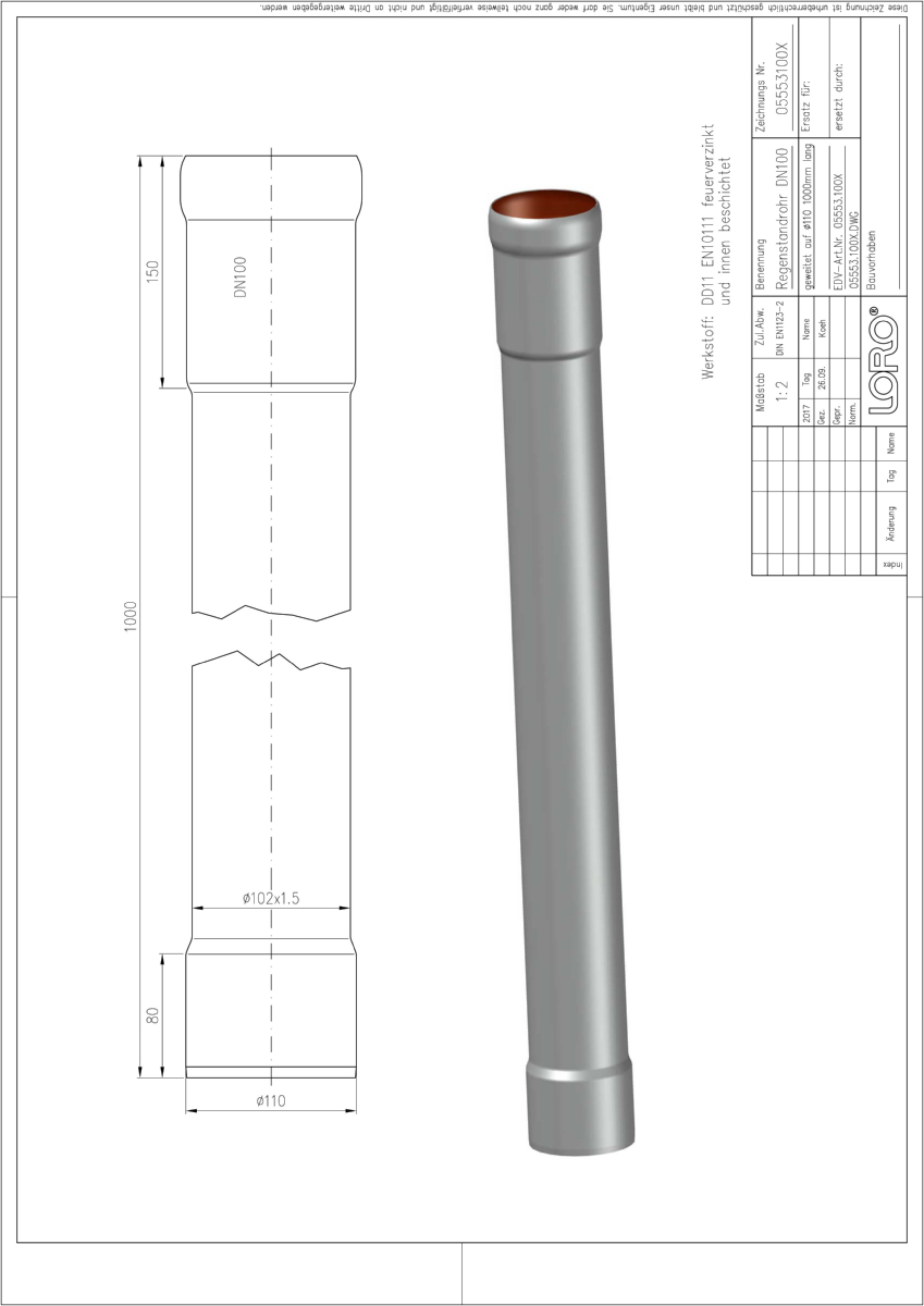 LORO-X Sanierungs-Regenstandrohr, aus Stahl, feuerverzinkt, rund, ohne Reinigungsöffnung nach DIN EN 1123 mit erhöhtem Qualitätsstandard gemäß RAL-Gütezeichen, mit 2-Kammern-Steckmuffenverbindung, Baustoffklasse A1, formstabil, bruchfest, rückstausicher, langlebige Innenbeschichtung gemäß DIN EN ISO 2178 auf Basis einer 2K-Epoxid-Kombination, Farbton: Rotbraun, mit Auslauf 110 mm zum Übergang auf die Grundleitung aus Gussrohr oder auf Kunststoffrohr, 1000 mm, DN 100