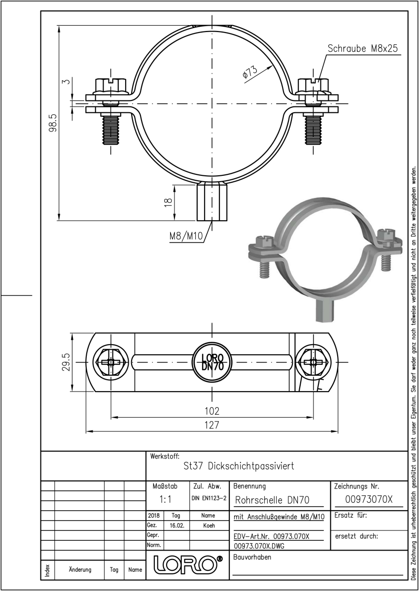 LORO-X Rohrschelle, aus Stahl, mit Kombi Gewinde M 8/10 ohne Schalldämmung, DN 70