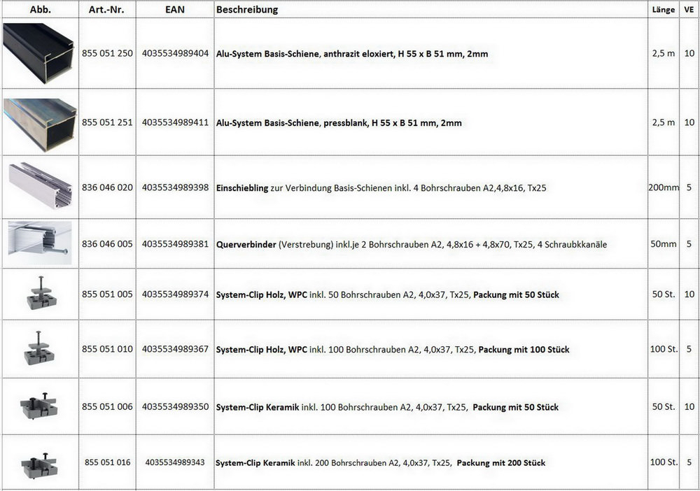 Die System-Clips aus stabilem PA6 Kunststoff werden einfach in die System-Schiene eingeklickt.