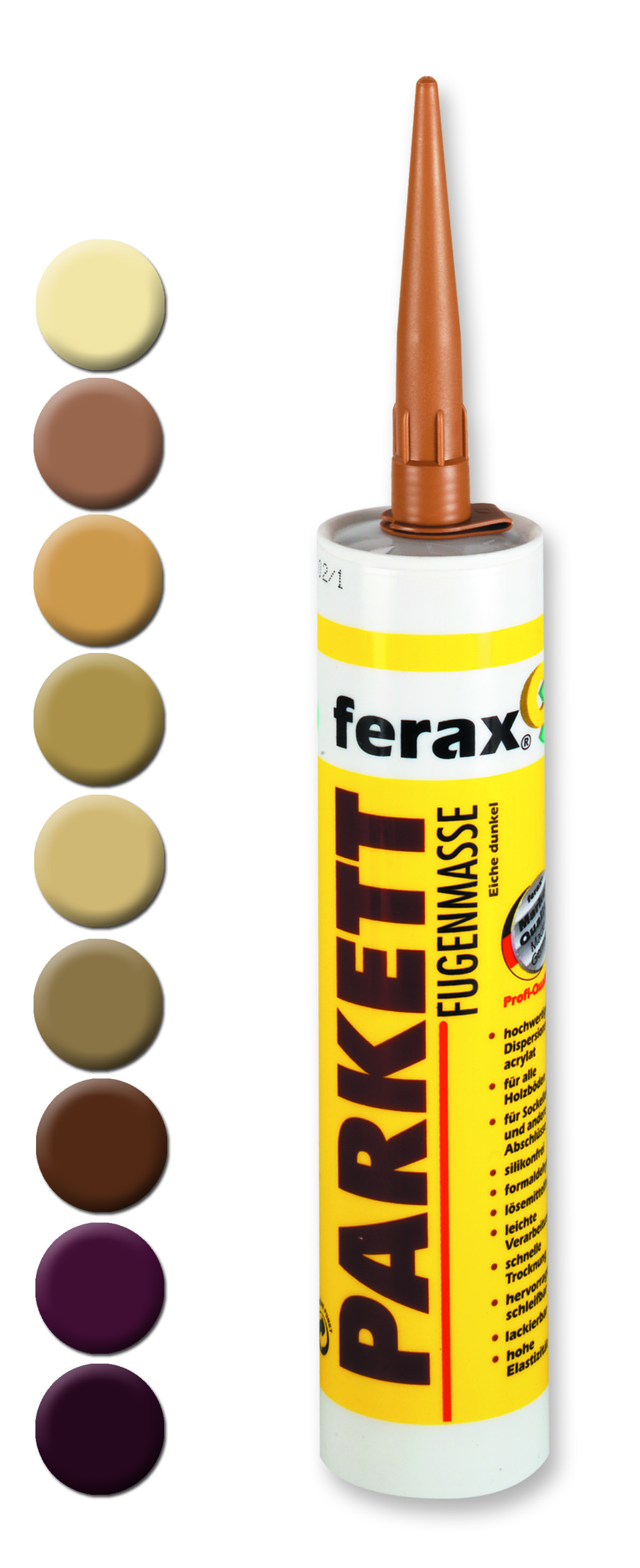 ferax®-Parkettfugenmasse ist eine gebrauchsfertige, einkomponentige, silikonfreie, lösemittel- und formaldehydfreie Fugenmasse auf der Basis einer hochwertigen Polyacrylat-Dispersion.