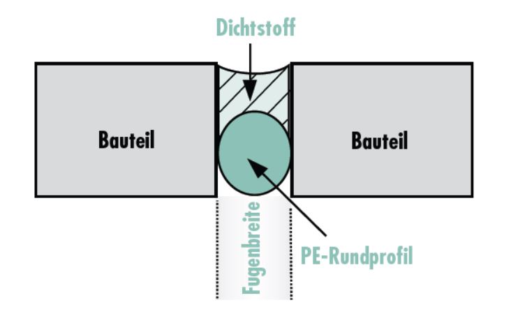 PE-Rundprofile (geschlossenzellig für Innen- und Außenbereich einsetzbar) werden in die Fuge eingelegt, um eine sogenannte 3-Flankenhaftung zu verhindern. Der Dichtstoff haftet nur an den Bauteilen und nicht am Untergrund und kann so Bauteilbewegungen aufnehmen. Gleichzeitig wird Dichtstoff eingespart. Sh. Tabelle für richtige Dimensionierung.