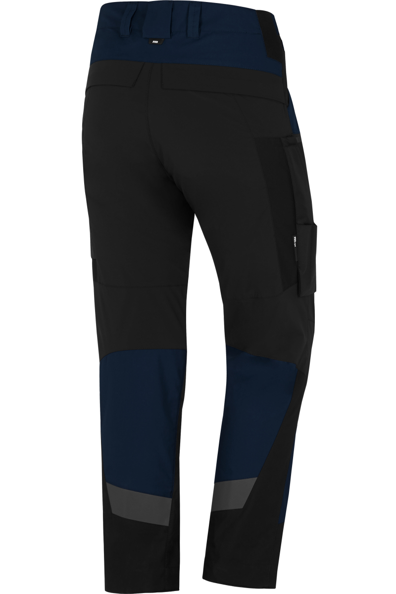 Arbeitshose elastisch, ultraleicht, atmungsaktiv und trotzdem robust durch FHB-Vollzwirn-Gewebe (1.), elastisch und widerstandsfähig im Gesäß-, Schritt- und Kniebereich durch Cordura-Stretch-Material (2.), körperbetont, elastische 3D-Frinlock-Einsätze für Komfort-Passform, Taschenbereich (Stift-, Messer- und Zollstock) sowie Stoßband aus 100% Polyamid (Cordura), mit RV verschließbare Handytasche, dehnbare Volumentasche mit herausnehmbarem Magnetknopf, 2 Gesäßpattentaschen ohne Knopf