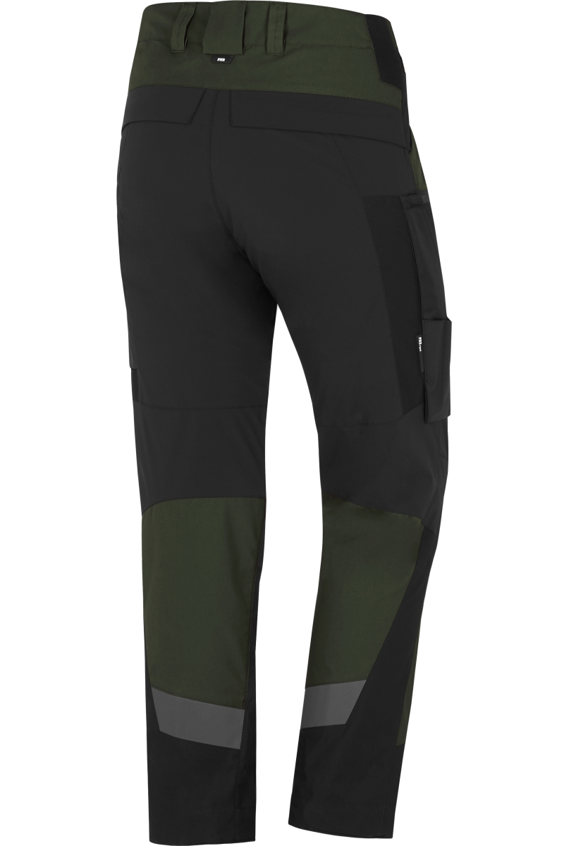 Arbeitshose elastisch, ultraleicht, atmungsaktiv und trotzdem robust durch FHB-Vollzwirn-Gewebe (1.), elastisch und widerstandsfähig im Gesäß-, Schritt- und Kniebereich durch Cordura-Stretch-Material (2.), körperbetont, elastische 3D-Frinlock-Einsätze für Komfort-Passform, Taschenbereich (Stift-, Messer- und Zollstock) sowie Stoßband aus 100% Polyamid (Cordura), mit RV verschließbare Handytasche, dehnbare Volumentasche mit herausnehmbarem Magnetknopf, 2 Gesäßpattentaschen ohne Knopf