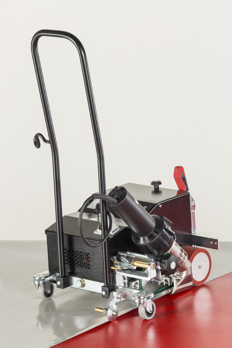 In Verbindung mit der Niederhaltevorrichtung für faltenfreies Schweissen erhält der Planen- und Dachplanenverarbeiter ein optimales Schweissergebnis. Das Gerät läuft selbsttätig nach Einschwenken des Schweisskopfes an.