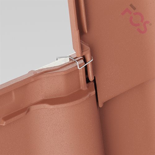 Die 492®-2 ist die einzige Klemmklammer, die mit einem Haken gleichzeitig den Kopf und die Seitenfalz von Dachziegeln ohne Vierfachüberdeckung im 4-Ziegel-Eck sichert.