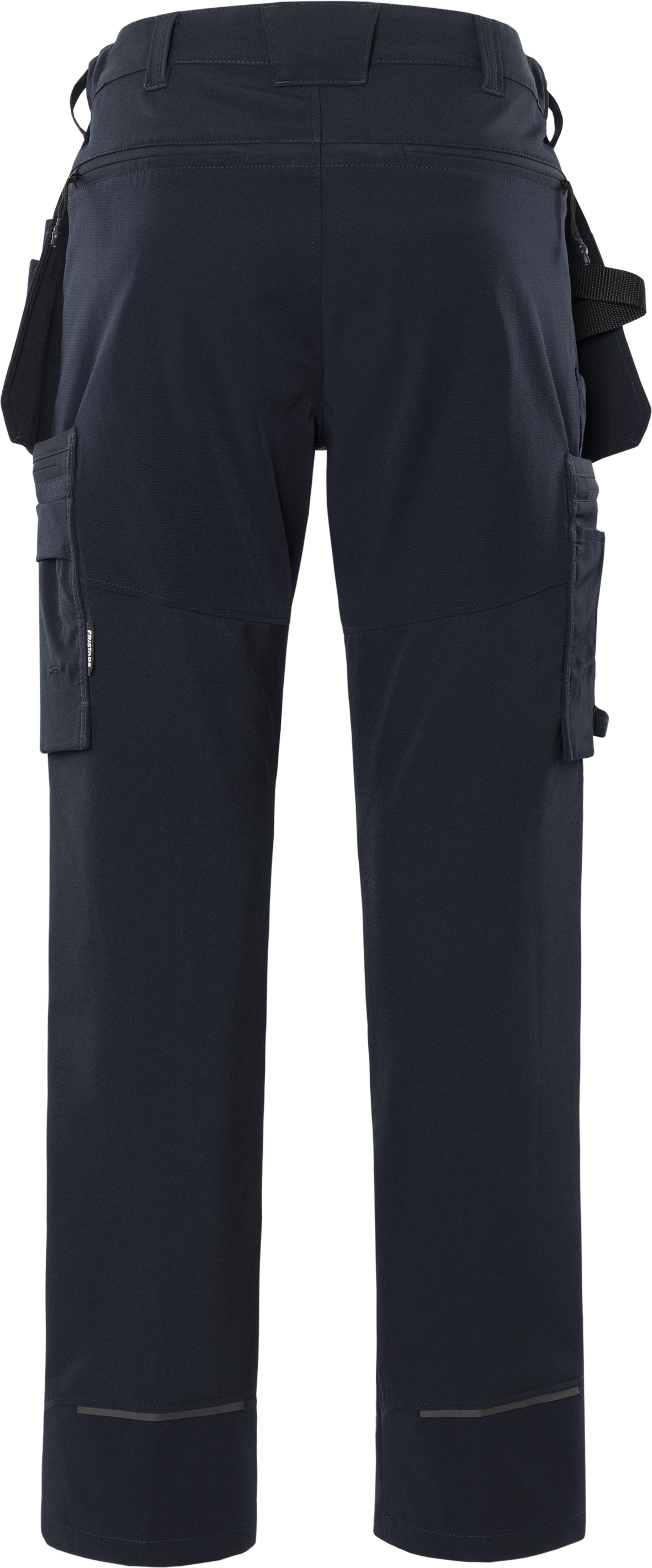 Leichter 4-Wege-Stretchstoff / Strapazierfähige Ripstop 4-Wege-Stretcheinsätze am oberen Vorder- und Rückenteil / Elastischer Bund / 2 lose hängende, verstärkte Taschen, eine mit 3 kleineren Taschen und Werkzeugschlaufen, eine mit Extratasche / Verdeckter Front-Knopf / 2 Vordertaschen / 2 Gesäßtaschen mit Reißverschluss / Doppelt verstärkte Schrittnaht / Hammerschlaufe / Zollstocktasche aus Ripstop-Stretch, Beintasche mit Druckknopfverschluss, Tasche mit Reißverschluss, Stifttasche, 2 Werkzeugtaschen sowie Knopf und Schlaufe für ein Arbeitsmesser / Beintasche mit Druckknopf, Tasche mit Reißverschluss, Handytasche und Ausweistasche mit Patte, D-Ring unter Patte / Ripstop-Stretch-Knietaschen mit Öffnung von oben mit Klettverschluss / Höhenverstellung der Kniepolster in den Knietaschen / Reflektierende Details an Knien und Beinenden / Ripstop-verstärkte Beinenden / Geprüft und zugelassen gemäß EN 14404 (in Kombination mit Kniepolster 124292) / OEKO-TEX® zertifiziert.