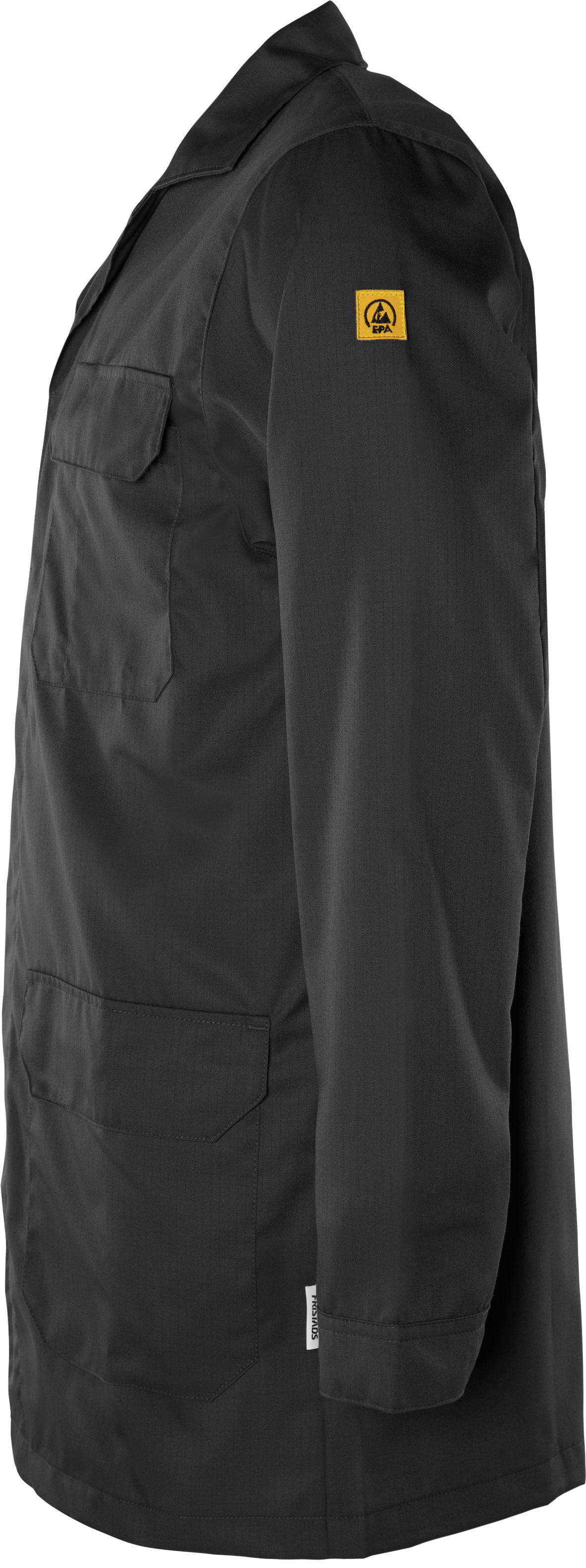 Verdeckte Druckknopfleiste / Brusttasche mit Stifttasche, Patte mit Druckknopf / 2 Vordertaschen mit Patten und Druckknöpfen / Rückseitiger Bewegungsschlitz / Ärmel mit Druckknopf verstellbar / Geprüft und zugelassen gemäß IEC 61340 / OEKO-TEX® zertifiziert.