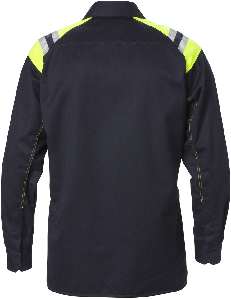 Über die Schulter führende Reflexstreifen / Verdeckter Druckknopfverschluss unter der Frontleiste / Armabschlüsse mit verdecktem Druckknopfverschluss / 2 Brusttaschen mit Patte und verdecktem Druckknopfverschluss, eine mit Stiftschlaufen / Verlängerte Rückenpartie / Metallfreies Kleidungsstück / Geprüft und zugelassen gemäß EN 61482-1-2 Klasse 1, EN 61482-1-1 EBT: 9,9 cal/cm² HAF: 78,0% (siehe Tabelle für Störlichtbogen geprüften Kleidungskombinationen EN 61482-1-2 Klasse 2 und offene Lichtbogen gemäß EN 61482-1-1), EN ISO 11612 A1 A2 B1 C1 F1, EN 1149-5 und EN 13034 Typ PB [6] / Industriewäsche geeignet gemäß ISO 15797 / OEKO-TEX® zertifiziert.