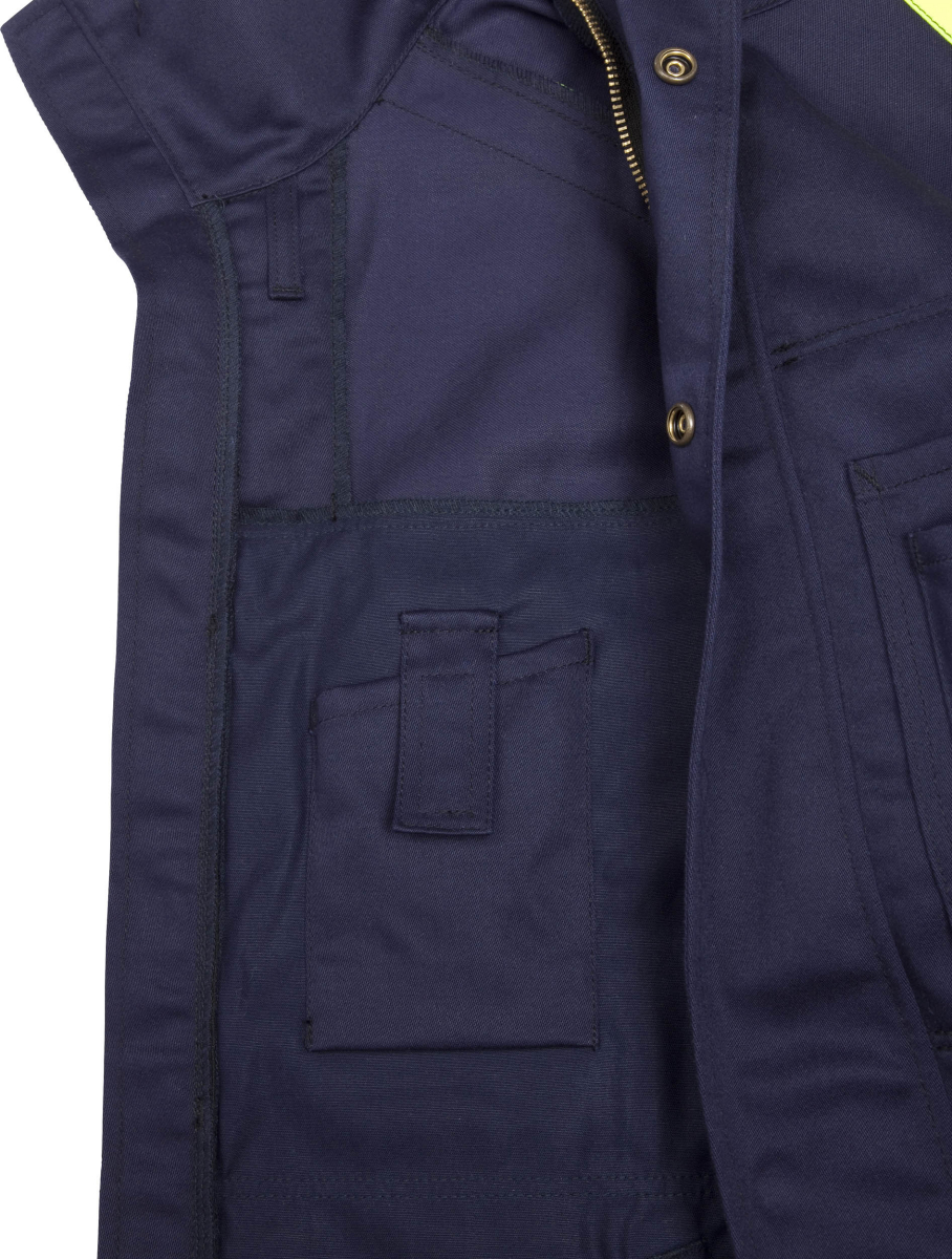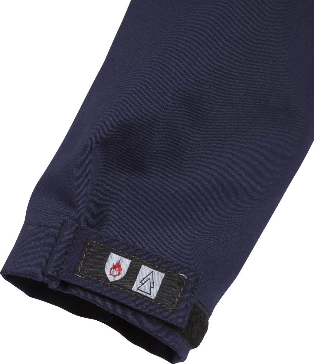 Verdeckter Reißverschluss mit Druckknopfleiste bis zum oberen Kragenrand / 2 Brusttaschen – eine mit Patte und Druckknöpfen, die andere mit extra Tasche und Stifttasche / 'Napoleon'-Tasche unter rechter Brusttasche / Innentasche mit Reißverschluss für Zugriff von außen / Verdeckter Knopf und Schlaufe für ein Arbeitsmesser / 2 Seitentaschen / Handytasche (innen) mit Schlaufe für Kopfhörer / Verstellbare Armabschlüsse mit Klettverschluss / Verstellbare Bundweite mit Knöpfen / Geprüft und zugelassen gemäß EN 61482-1-2 Klasse 1 und EN ISO 11612 A1 B1 C1 / Industriewäsche geeignet gemäß ISO 15797 / OEKO-TEX® zertifiziert.
