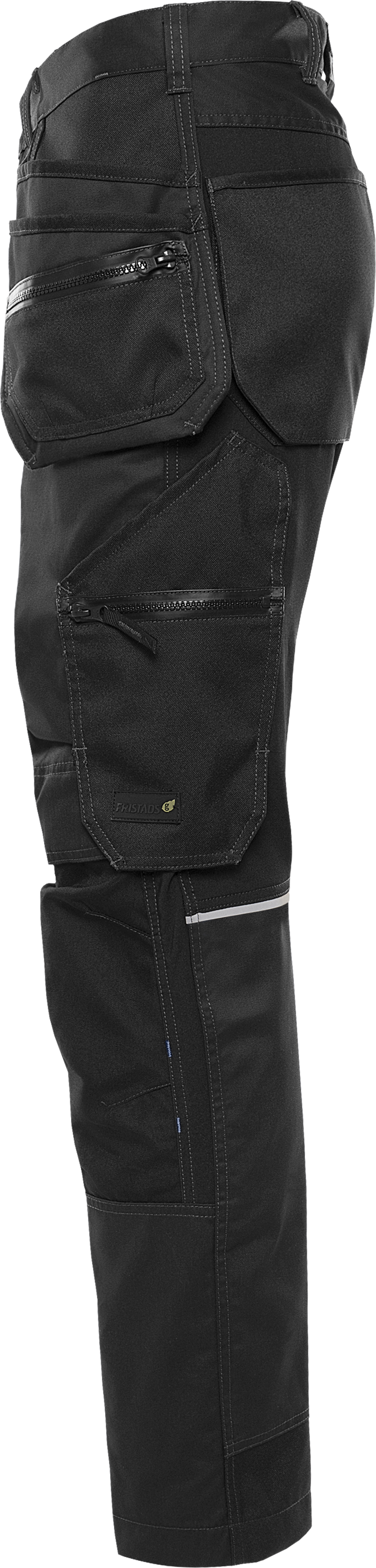 Teilweise recyceltes Material / Mechanischer Stretch / Große 4-Wege-Stretcheinsätze auf der Rückseite und im Schritt / 2 lose Hängetaschen aus strapazfähigem Material, eine mit 2 Taschen, davon eine mit Reißverschluss, eine mit 3 kleineren Taschen und Werkzeugschlaufen / 2 Vordertaschen / 2 Gesäßtaschen / Extra Schlaufen vorne für ID-Karten oder Schlüssel / Doppelt verstärkte Schrittnaht / Hammerschlaufe / Zollstocktasche us strapazfähigem Material, mit Stifttasche und verdecktem Knopf und Schlaufe für Messerscheide / Große Beintasche, / Große Beintasche aus strapazfähigem Material, auch für Zollstock, mit Reißverschlusstasche / CORDURA®-verstärkte Knietaschen mit Öffnung von oben / Höhenverstellung für Knieschützer in der Knietasche / Verstärkter Beinabschluss aus strapazfähigem Material / Verstellbare Beinlänge mit 5 cm Saumzugabe / Reflektierende Details in den Kniekehlen / Geprüft nach EN 14404 zusammen mit Knieschützern 124292 / OEKO-TEX® zertifiziert.
