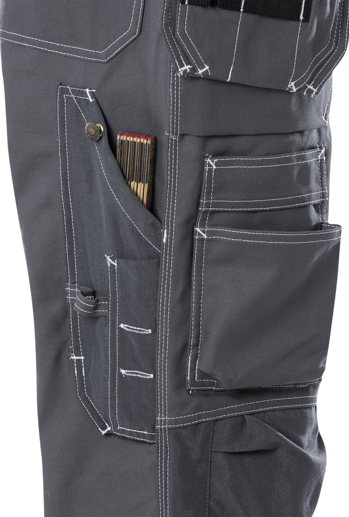 FAS®, Fristads' bester Twill / 2 CORDURA®-verstärkte, einsteckbare, lose hängende Außentaschen – eine mit extra Tasche, die andere mit 3 kleinen Taschen und Werkzeugschlaufen / 2 große Vorder- und Gesäßtaschen / 2 Hammerschlaufen - eine verstellbar / Knopf und Schlaufe für ein Arbeitsmesser / Beintasche mit Patte / Verdeckte Ausweistasche / Zollstocktasche / Stifttasche / Handytasche / Werkzeugtasche / Teppichlegertasche / CORDURA®-verstärkte Knietaschen, mit Öffnung innen, für höhenverstellbare Kniepolster / Geprüft und zugelassen gemäß EN 14404 (in Kombination mit Kniepolster 124292) / OEKO-TEX® zertifiziert.