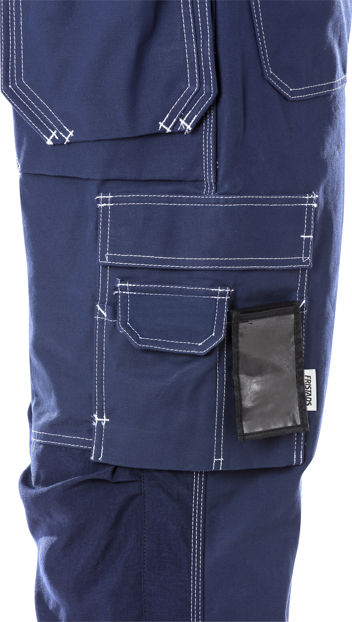 FAS®, Fristads' bester Twill / 2 CORDURA®-verstärkte, einsteckbare, lose hängende Außentaschen – eine mit extra Tasche, die andere mit 3 kleinen Taschen und Werkzeugschlaufen / 2 große Vorder- und Gesäßtaschen / Verdeckte Ausweistasche / Zollstocktasche / Stifttasche / Handytasche / Werkzeugtasche / Beintasche mit Patte / 2 Hammerschlaufen - eine verstellbar / Knopf und Schlaufe für ein Arbeitsmesser / CORDURA®-verstärkte Knietaschen, mit Öffnung innen, für höhenverstellbare Kniepolster / Geprüft und zugelassen gemäß EN 14404 (in Kombination mit Kniepolster 124292) / OEKO-TEX® zertifiziert.