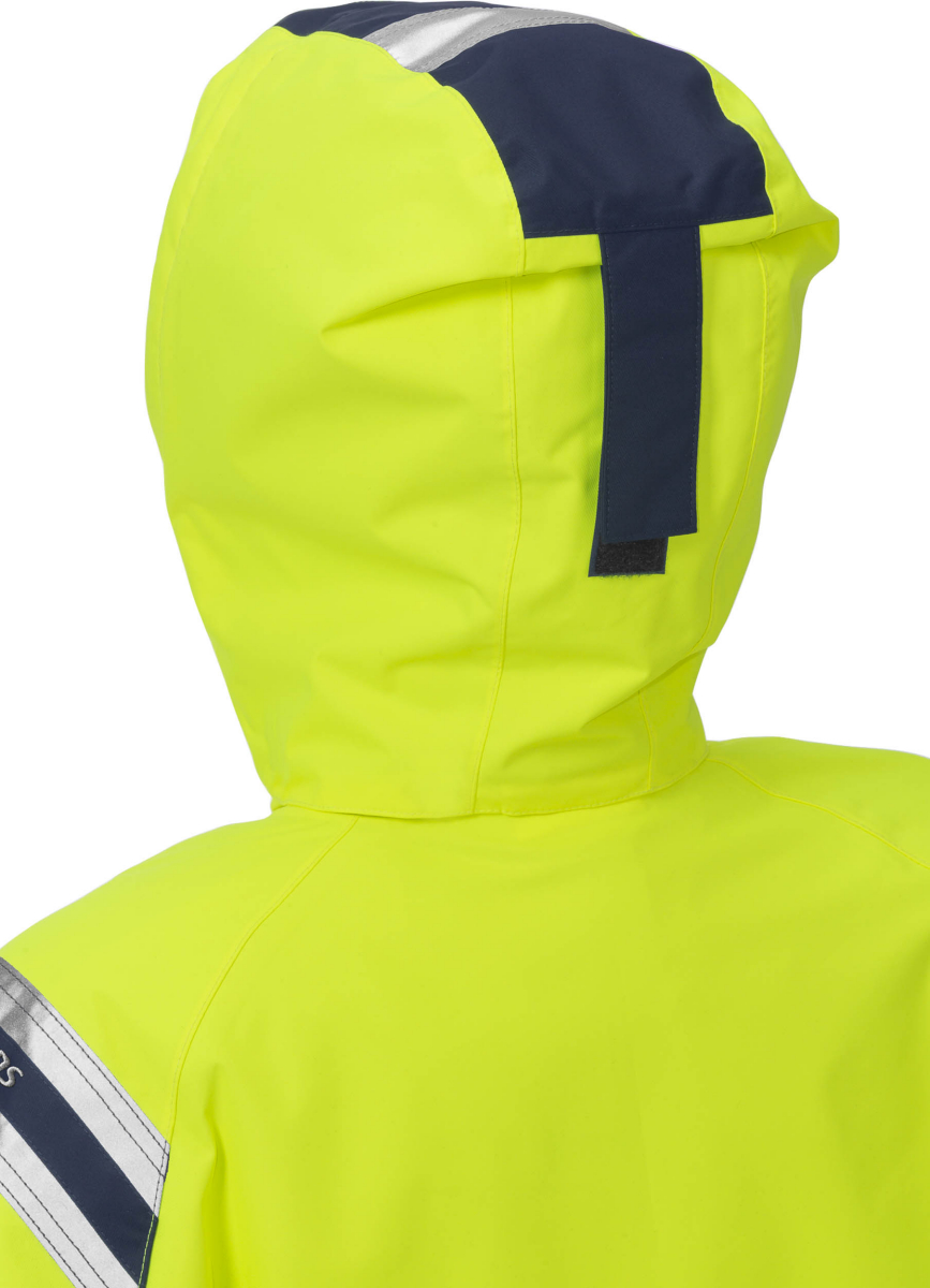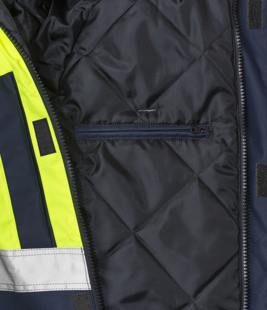 Airtech®, wind- und wasserdicht, atmungsaktiv / Vollständig gefüttert (Steppfutter) / Abnehmbare, verstellbare gefütterte Kapuze / Kragen mit Fleece-Futter / Über die Schulter führende Reflexstreifen / Verdeckter Reißverschluss mit Druckknopfleiste bis zum oberen Kragenrand / 2 Brusttaschen mit Reißverschluss / ID-Kartentasche / Kartentasche mit von außen zugänglicher Handytasche (innen) und Knopfloch und Schlaufe für Kopfhörer, von außen zugänglich / 2 Fleece-gefütterte Vordertaschen mit Reißverschluss / Verstellbare Unterkante / 2 Innentaschen mit Reißverschluss und Knopfloch und Schlaufe für Kopfhörer / Mesh-Material im Armloch / Reißverschluss im Futter ermöglicht Stickereien und Wärmetransfers / Elastische Ärmelinnenbündchen mit Daumenschlaufen / Verstellbare Ärmelabschlüsse / Verlängerte Rückenpartie / Wassersäule 10.000 mm / Geprüft und zugelassen gemäß EN ISO 20471 Klasse 2 (Gr. XS) und Klasse 3 (Gr. S-4XL), EN 343 Klasse 3/1 und EN 342. Hauptmaterial geprüft gemäß EN 343 Klasse 3/3 / Industriewäsche geeignet gemäß ISO 15797.