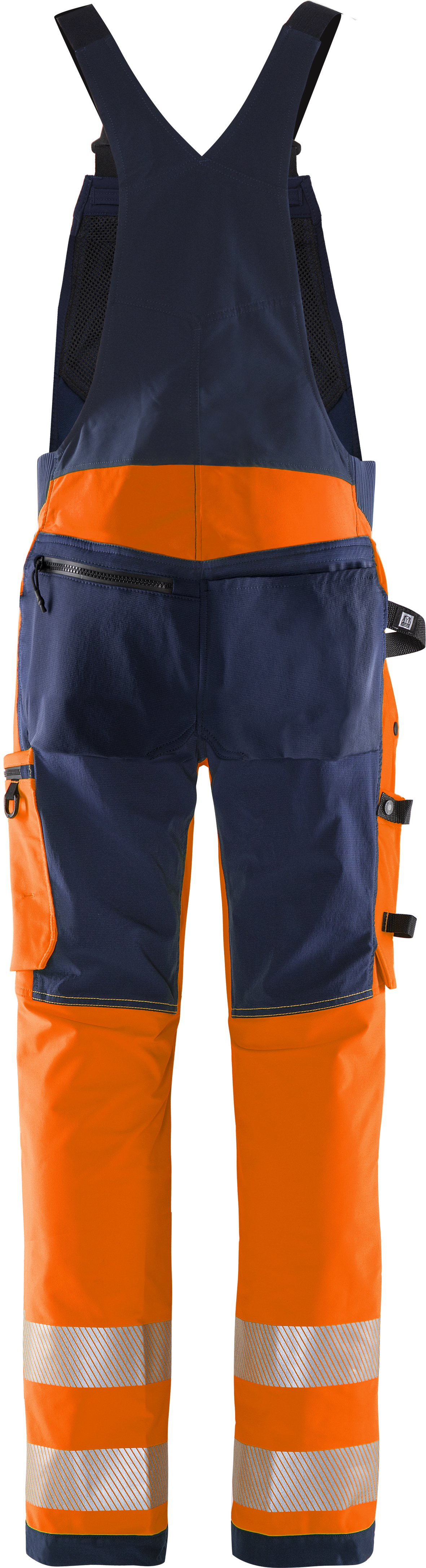 Nachhaltige High Vis Stretch-Latzhose aus durchgehendem 4-Wege-Stretchmaterial mit Stretcheinsätzen am Bund, und Verstärkungen an exponierten Stellen. Hergestellt aus recycelten Materialien. Mit EPD (Environmental Product Declaration).