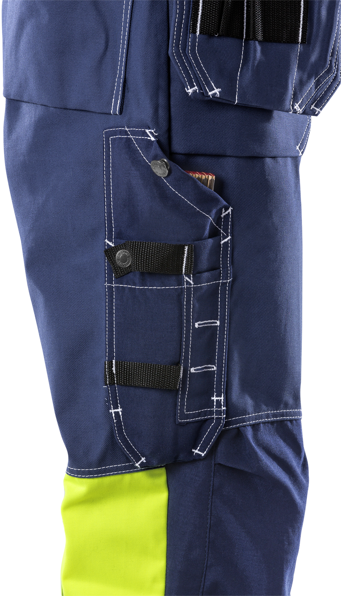 FAS® Twill / Schmutz-, öl-, wasserabweisend / Doppelt abgesteppte Reflexstreifen / 2 CORDURA®-verstärkte, einsteckbare, lose hängende Außentaschen – eine mit extra Tasche, die andere mit 3 kleinen Taschen und Werkzeugschlaufen / 2 Vordertaschen mit Dehnungsfalte / 2 Gesäßtaschen mit Dehnungsfalte - eine mit Patte und Klettverschluss / 2 D-Ringe / Beintasche mit Patte und Druckknopf, mit Handytasche und verdecktem Ausweishalter / 2 Hammerschlaufen / CORDURA®-verstärkte Zollstocktasche (über der Seitennaht) - mit Werkzeugtasche, Stifttasche, 2 Knöpfe und Schlaufen für 2 Arbeitsmesser / Ergonomisch geformte Knie / CORDURA®-verstärkte Knietaschen, mit Öffnung innen, für höhenverstellbare Kniepolster / Geprüft und zugelassen gemäß EN ISO 20471 Klasse 1 und EN 14404 (in Kombination mit Kniepolster 124292) / OEKO-TEX® zertifiziert.