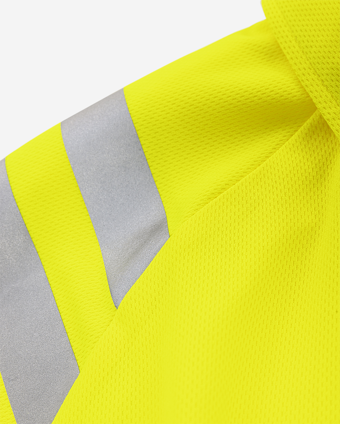 Recyceltes Funktionsstrickmaterial / Stretch-Reflexionstransfers / Kragen aus doppeltem Material / Raglanärmel / 5 cm Zwickel mit Lücke im Reflexionstransfer an den Seiten und Ärmeln für zusätzlichen Komfort / Geprüft nach EN ISO 20471 Klasse 2 in Größen XS-M und Klasse 3 ab Größe L / OEKO-TEX® zertifiziert.