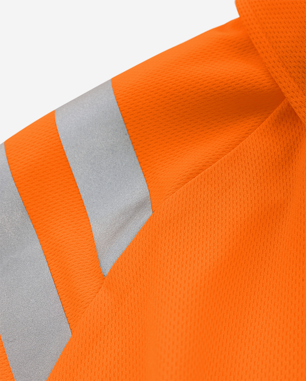 Recyceltes Funktionsstrickmaterial / Stretch-Reflexionstransfers / Kragen aus doppeltem Material / Raglanärmel / 5 cm Zwickel mit Lücke im Reflexionstransfer an den Seiten und Ärmeln für zusätzlichen Komfort / Geprüft nach EN ISO 20471 Klasse 2 in Größen XS-M und Klasse 3 ab Größe L / OEKO-TEX® zertifiziert.