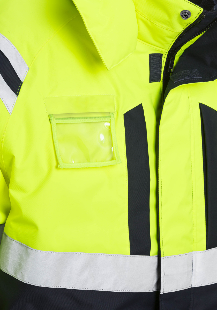 Airtech®, wind- und wasserdicht, atmungsaktiv / Vollständig gefüttert (Steppfutter) / Über die Schulter führende Reflexstreifen / Verdeckter 2-Wege-Reißverschluss mit Druckknopfleiste bis zum oberen Kragenrand / Kragen mit Fleece-Futter / Abnehmbare, verstellbare gefütterte Kapuze / 2 Brusttaschen mit Reißverschluss / ID-Kartentasche / Kartentasche mit von außen zugänglicher Handytasche (innen) und Knopfloch und Schlaufe für Kopfhörer, von außen zugänglich / 2 Innentaschen mit Reißverschluss / Verstellbares Zugband in der Taille / Elastische Ärmelinnenbündchen mit Daumenschlaufen / Verstellbare Ärmelabschlüsse / 2 Vordertaschen mit verdecktem Reißverschluss / 2 Gesäßtaschen mit Patten und Klettverschluss / Zollstocktasche mit extra Tasche / 2 geräumige Beintaschen mit Patte und Klettverschluss / Ergonomisch geformte Knie / Von innen zugängliche Knietaschen für höhenverstellbare Kniepolster / Verdeckter Bein-Reißverschluss bis zum Knie / Verstellbare Beinabschlüsse / Schneesperre / Reißverschluss im Futter ermöglicht Stickereien und Wärmetransfers / Wassersäule 10.000 mm / Geprüft und zugelassen gemäß EN ISO 20471 Klasse 3, EN 343 Klasse 3/1, EN 342 und EN 14404 (in Kombination mit Kniepolster 124292). Hauptmaterial geprüft gemäß EN 343 Klasse 3/3 / Industriewäsche geeignet gemäß ISO 15797.