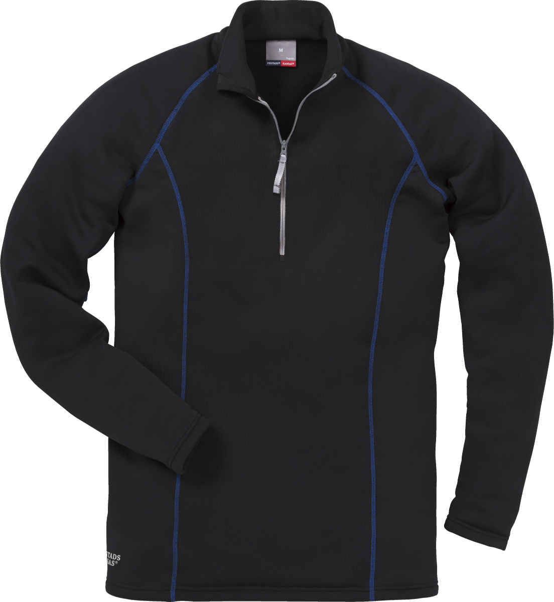 Polartec® Power Stretch® Mikro-Fleece / Transportiert Feuchtigkeit vom Körper weg / Hohe Atmungsaktivität / Trocknet schnell / Hohe Wärmeisolierung / Nähte in Kontrastfarbe (blau-schwarz) / OEKO-TEX® zertifiziert.