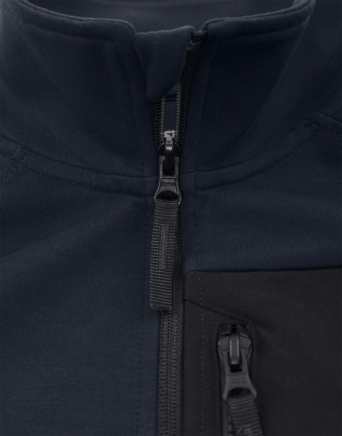 Double-Face Material / Durchgehender Frontreißverschluss / Brusttasche mit Reißverschluss / 2 Vordertaschen mit Reißverschluss / Rippstrickbündchen an Ärmeln und Saum / Kontrastnähte / OEKO-TEX® zertifiziert.