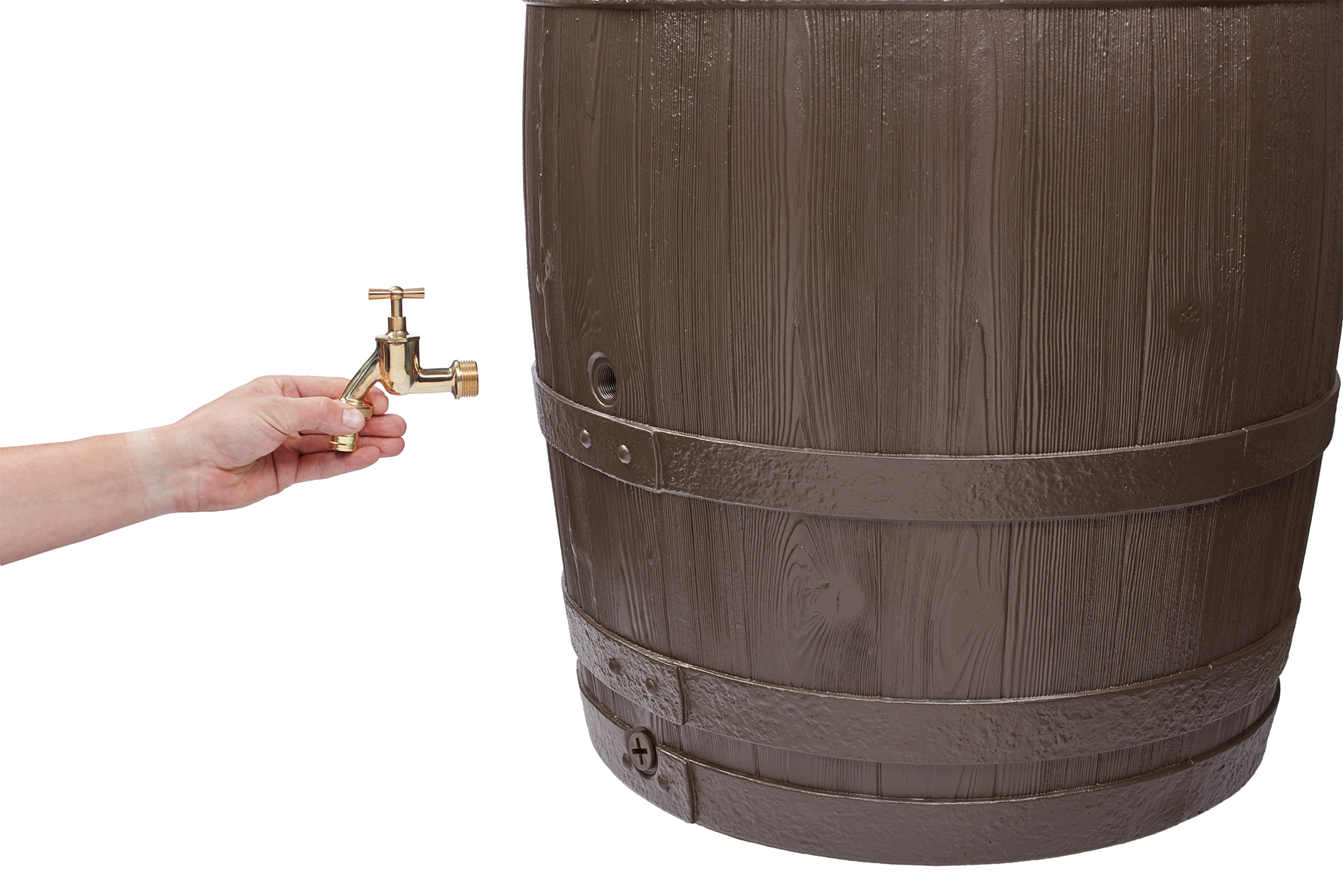 - Regenspeicher in Form eines rustikalen Holzfasses in täuschend echt wirkender Holzstruktur